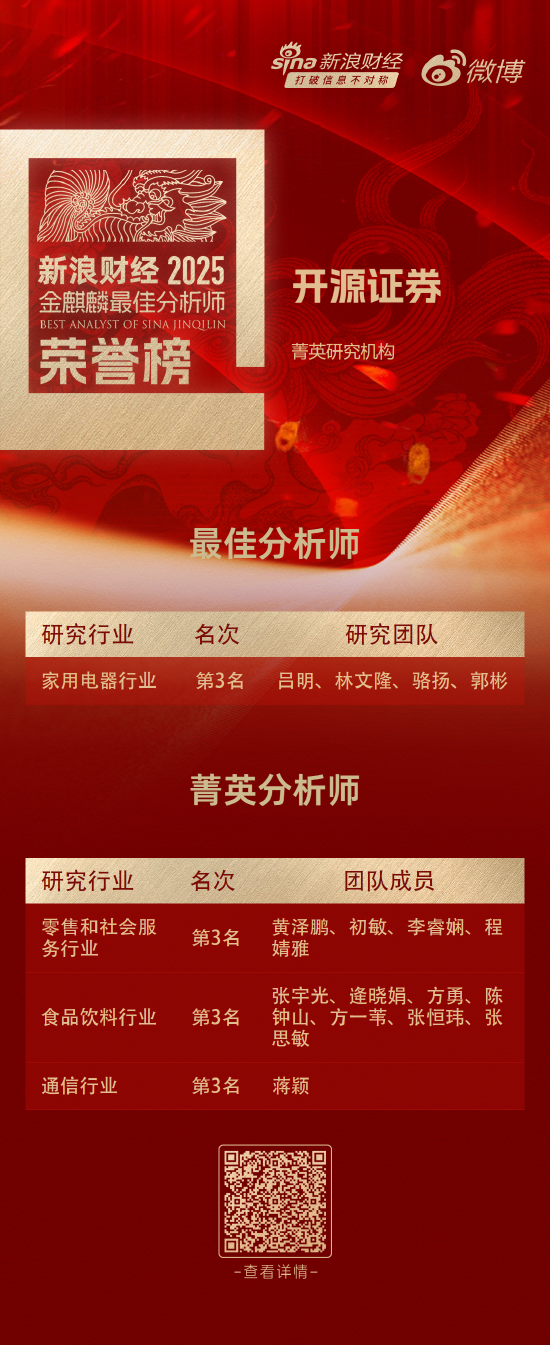 11月28日,第七届新浪财经金麒麟最佳分析师评选结果揭晓,开源证券研究团队荣获“菁英研究机构第十名”。