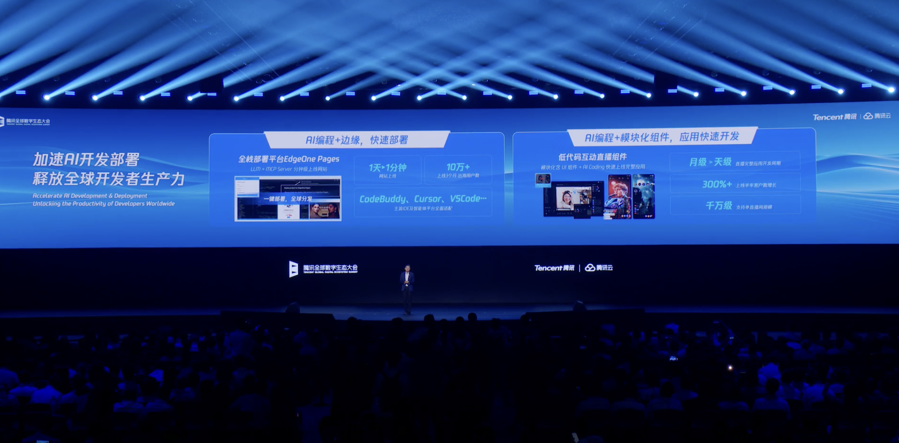 腾讯云还通过加速AI开发部署,释放全球开发者的生产力。其推出全栈部署平台EdgeOne Pages,支持大语言模型+MCP Server分钟级上线网站,将网站上线时间从1天缩短至1分钟,上线3个月出海用户已超10万。
