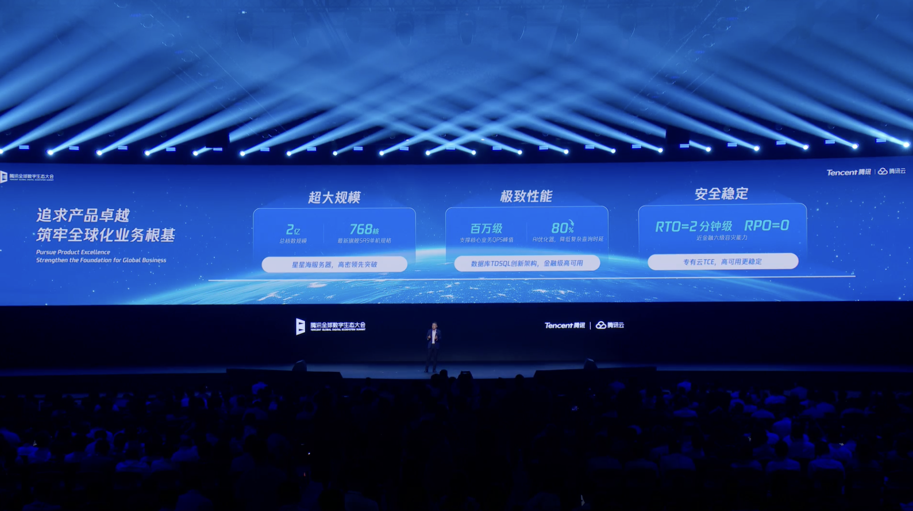 除了AI布局,腾讯云也在不断提升全球化覆盖。邱跃鹏谈道,腾讯云的每一款产品都应该服务全球客户,今年其将星星海服务器SA5升级到了SA9,从过去的512核升级到了768核,在全球总核数规模已达2亿核;腾讯云也升级了其数据库产品,数据库TDSQL创新架构,支持核心业务QPS峰值达到百万级别,AI优化器使得复杂查询时延降低80%;专有云TCE也加速走向全球,RTO达到了2分钟级别,具备了接近金融六级的容灾能力。