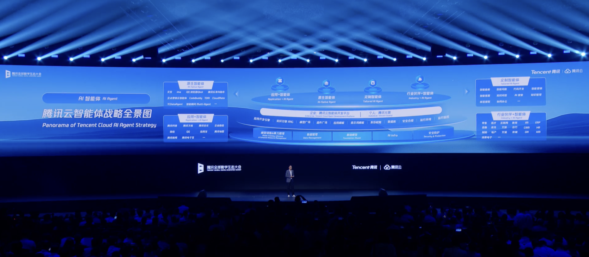 基于这一判断,腾讯提出了全新的“智能体战略”,并在本次大会上正式发布“腾讯云智能体战略全景图”——从基础设施、开发平台到应用生态,为企业提供对应的工具和支持。