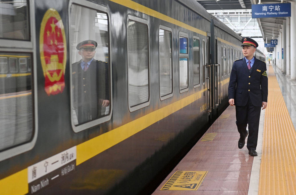 傍晚,在中国南宁站,T8701次列车准点启程奔赴越南河内;夜间,越南河内嘉林站,对开的T8702次列车也驶向中国。在这条中越国际联运旅客线路上,每天都在上演“双向奔赴”的旅程。